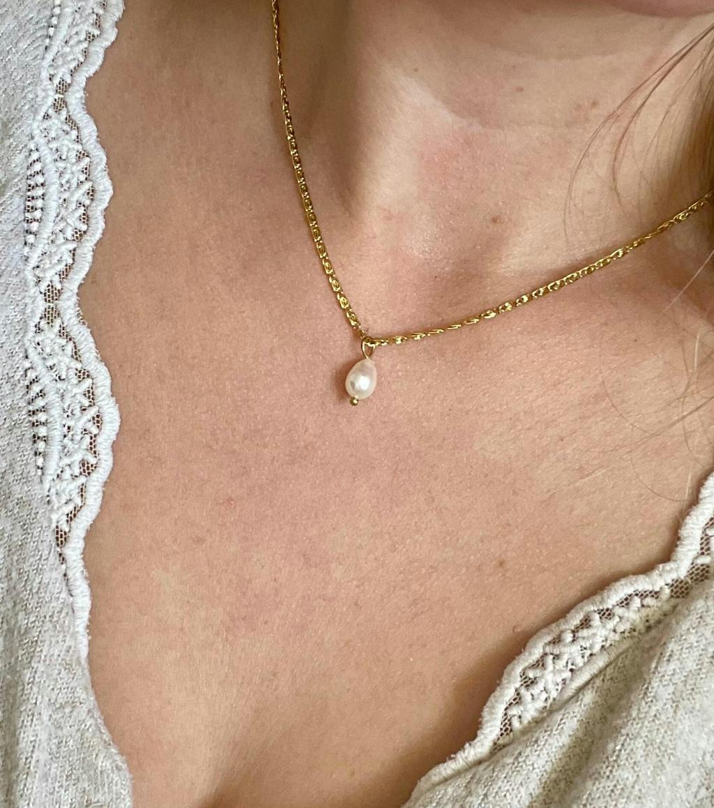 Le collier intemporel qui vous suivra partout : délicat en chaîne fine qui rappelle les mouvements des vagues 🌊 , avec une jolie perle d'eau douce en pendentif. Un bijou simple et élégant, facile à porter au quotidien et parfait à offrir.